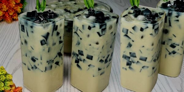 Nikmati segarnya minuman es cincau teh susu yang menyegarkan, perpaduan rasa manis dan lembut dari bahan alami, cocok untuk melepas dahaga di hari panas.